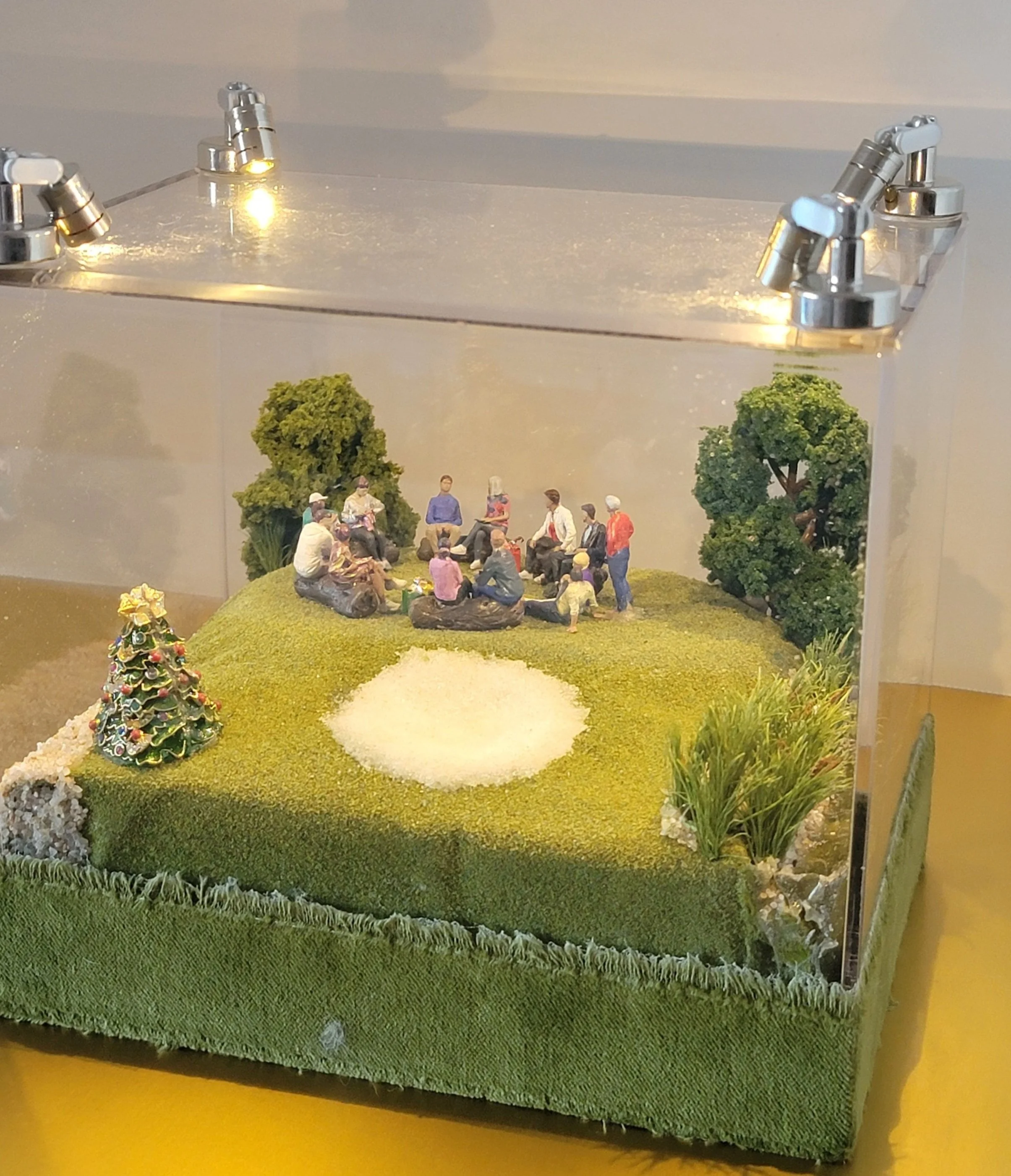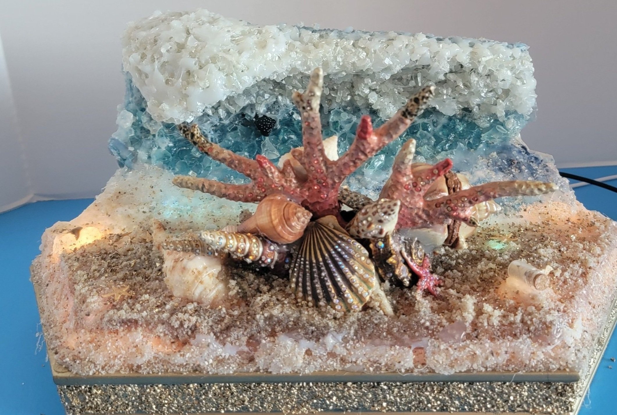 This is a live bark bottom, with a resin coating. A natural grape wood vine branch. On it, is a glass piece perfectly fitted into the branch. It’s filled with glow resin. Inside the glass has a sea turtle, divers and some shells that they collected over the years. To the left of the glass, you will find an owl trinket holder. This owl holds the ashes and is permanently sealed. I have magnetized this to the branch so that it could come off. If he ever decided he wanted to bring his owl and his Gamma with him. Keep moving left u will find a beach Scene. With beautiful coral piece that his wife picked up. Along with a message in a bottle. This actually has my mom’s handwritten card shrunken down to fit, that says, “missing you more then you know” This was a card she sent during the pandemic, when it was not possible to see her. (Moving on) Just In front of the bark, is a baby turtle breaking out of his shell. As you keep heading over the other side, I wanted to do something for his wife, so I made a small field and put a cute figurine from Jay Strongwater. This standing bunny with the floppy ears was so cute. I also added a multi changing light under the branch. This was it also can light up at night and be a very calming Scene.